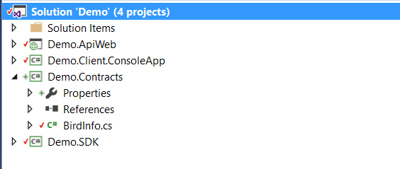 - 調整 projects 之間的 reference, 原本的 project 都加上 Demo.Contracts 的參考,重新編譯確認無誤後就完成了。