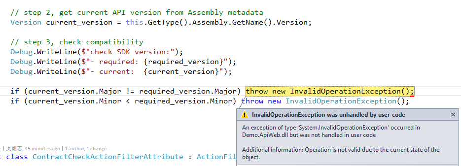 at Demo.ApiWeb.Controllers.SDKVersionCheckActionFilterAttribute.OnActionExecuting(HttpActionContext actionContext) in C:\\Users\\chicken\\Source\\Repos\\SDKDemo\\Demo.ApiWeb\\Controllers\\BirdsController.cs:line 59\r\n