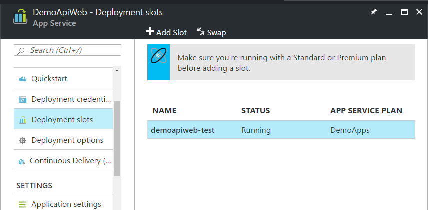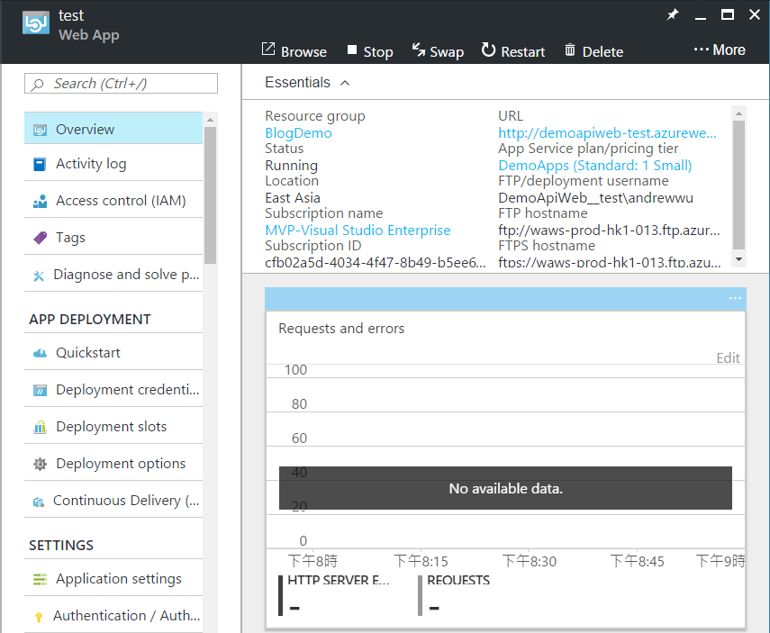 而 test slot 的服務網址,則是這個: http://demoapiweb-test.azurewebsites.net