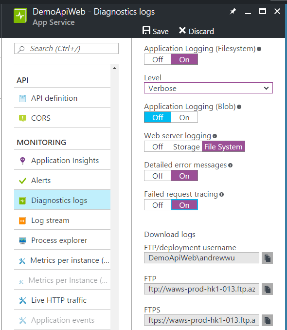 在 Monitor 的區塊內,還有其他的功能,包含查閱 event log, 查閱及時 http traffic 等等工具,還有讓你能在程式內埋好 log 後傳回 server 統計分析的 application insight, 都是很實用的功能。這些其實不影響你的 API 開發,但是當你的 API 要正式上線時,少了 這些 hosting environment 的支援,相信你一定會被這些瑣事分掉不少注意力。
