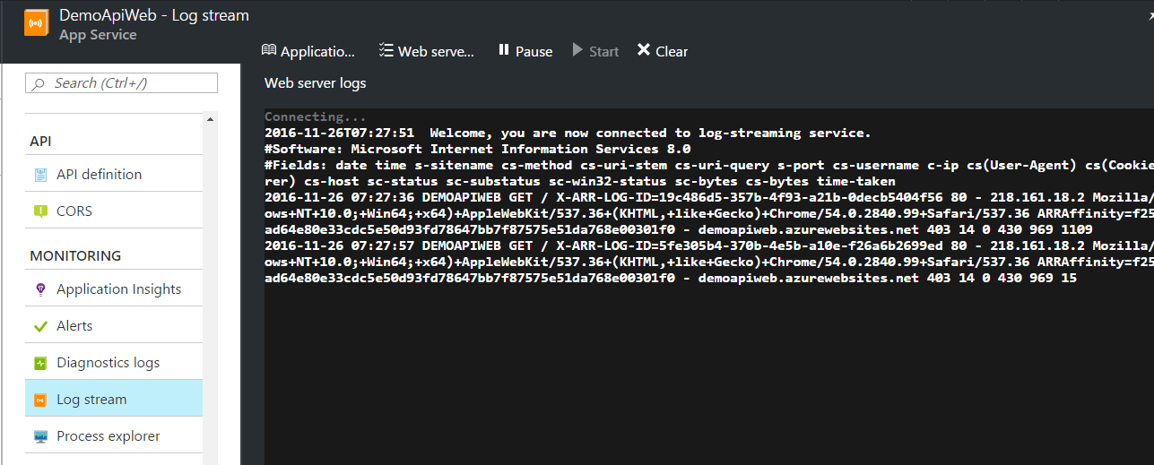 API 沒有畫面,要追查問題及除錯更需要後端管理的支援。如果我自己的 code 都沒有埋任何 log or error handling 機制,那 Azure websites 仍然提供這些機制讓我查問題。舉個例來說,這個 sample code 我第一次佈署上去就出問題:
