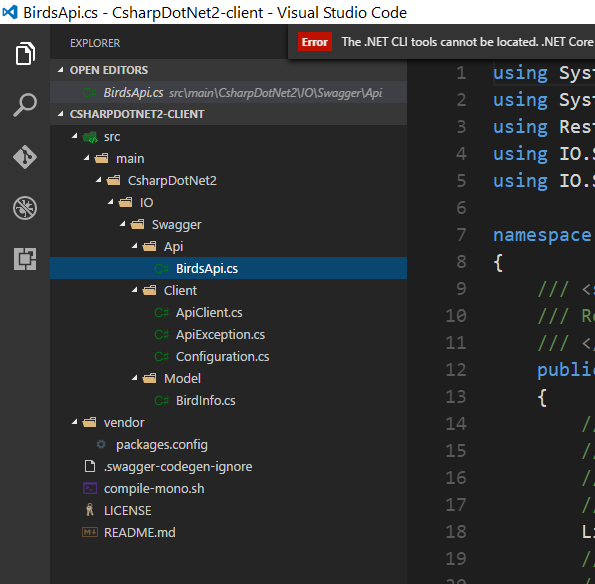 接下來,看看 client code generator 吧,一樣用 swagger editor, 選單 Home > Generate Client > C# .NET 2.0, 完成後會讓你 下載整個 project. 這次不看 code 了 (好多行…), 看 project 的結構: