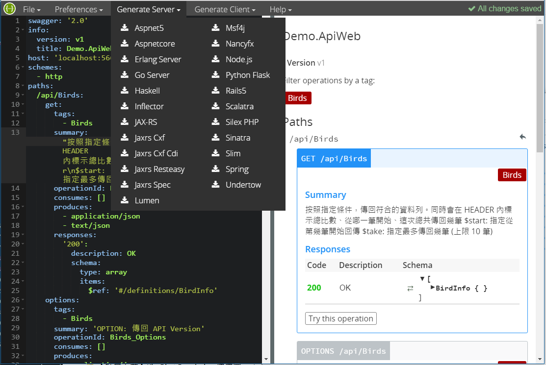 先寫好 server side code, 用 swashbuckle 自動產生對應的 swagger 各種應用
