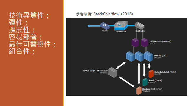 這張架構圖是我很喜歡舉的例子,因為我覺得她很有代表性,尤其是 stackoverflow.com 這網站在開發人員心中的價值更是無可取代。stackoverflow.com 在 2016/04 公布的這張架構圖,給我很大的啟發。為何這個全球開發人員眼中指標性的網站,願意採用這麼特別的架構? 用 .NET 開發網站的核心部分, 卻在部署時大量使用了 Linux / Open Source 的其他服務 (Redis, Elastic, HAProxy…) ?