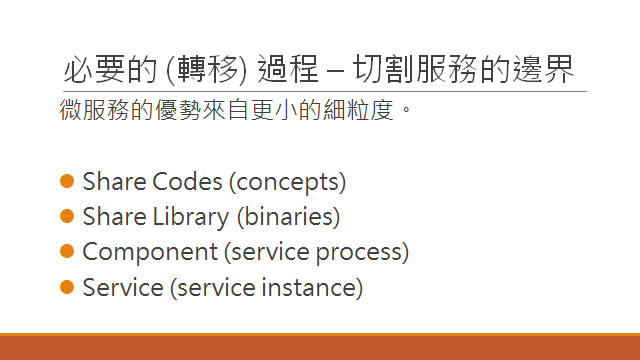 這兩張投影片,我想表達的是同一件事,就是你的商業邏輯,到底要按照什麼樣的法則來切割才洽當? 整個微服務架構導入的過程中,我認為 最困難的就是這點了。這才是關鍵啊! 在談論這點之前,先來看看有那些部分是技術上 “適合” 切割的?