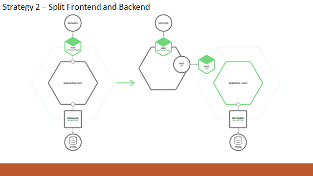 這個策略比上一個策略來的主動多了,主動將既有的單體式架構一分為二,分為前端及後端兩個服務。這個做法雖然看起來粗魯了些,不過老實說 還蠻有效的。幾年前我就用這個手法,成功的把兩層式架構 (WEB + DB) 切割為三層式架構 (WEB + AP + DB)。同樣的手法在微服務的時代也 能派上用場。