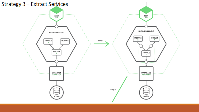 這張圖很清楚的說明改善策略了,當你想在既有的單體式 APP 增加新功能時,切記別再繼續讓狀況惡化了。你可以有計畫地進行重構。 新的功能,就直接開發成獨立的服務,同時在前端加上 request router (各種型態的 routing 都可以考慮! 例如 reverse proxy, 或是 API gateway 等等),把要存取的新功能部份 request,重新導向到新的 service 上面。存取既有的服務的 request 則繼續導向到既有的 service 上。