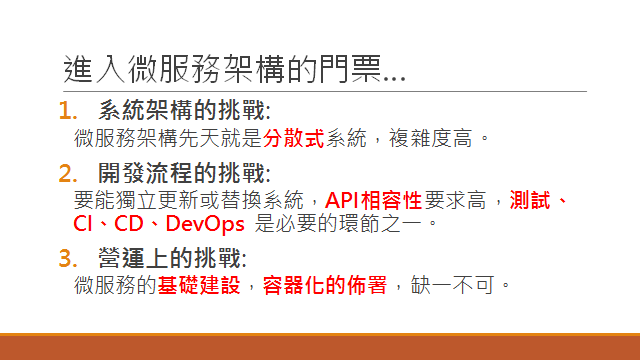 這三項都是跨入微服務架構一定會碰到的門檻啊,請先確定你的團隊的軟體工程的水準能輕鬆應付他們!