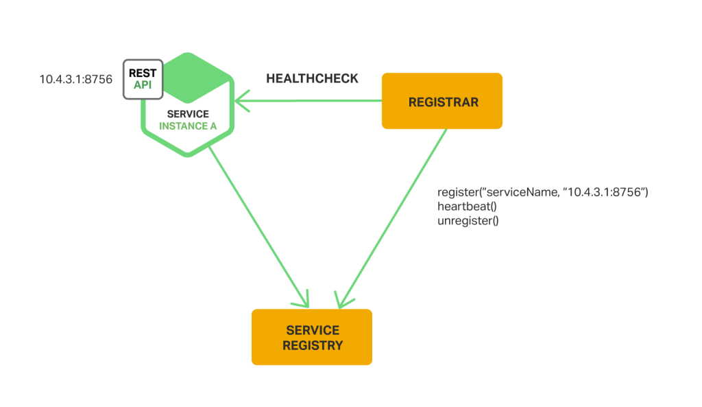 除了服務 10.4.3.1:8756 主動跟 Service Registry 回報之外,多了 Registrar, 會代表偵測服務本身 是否正常運作? 通常這樣的偵測會比較精確,因為它會真的呼叫 API 來驗證,比如 PingAPI(), 或是服務會專門 提供 Echo(), 或是 Diagnoistic() 之類的 API,專門拿來偵測健康狀態用。