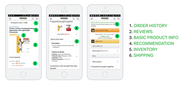 先來看看實際的使用情境: 假設 Amazon 網站已經微服務化了 (實際上也真的是沒錯),來想像一下這個 APP 為了實現畫面上的所有功能, 進入這個購物 APP 首頁時,究竟要從後端呼叫多少微服務的 API 才能湊齊這個畫面所需的所有資訊?