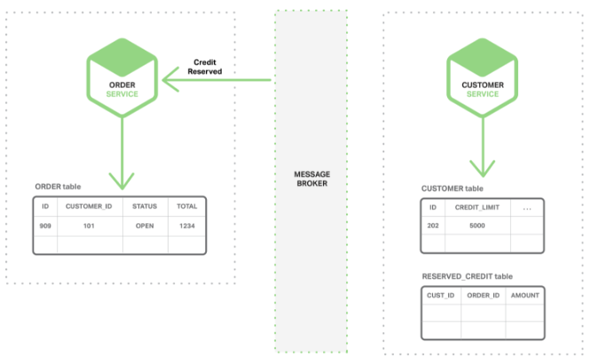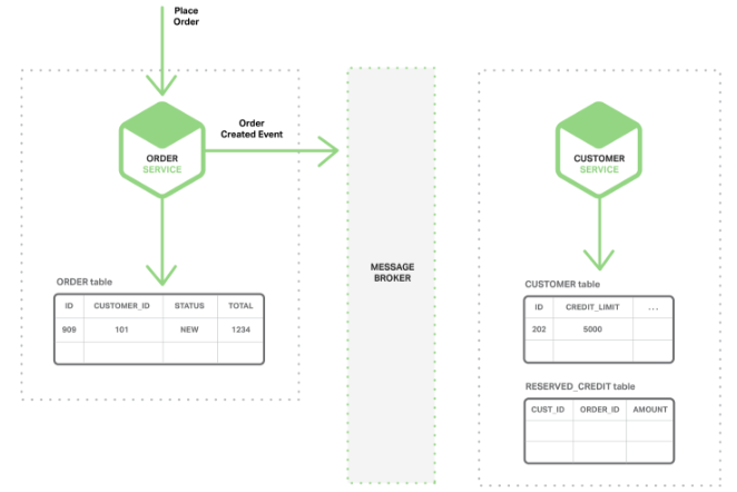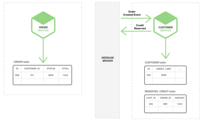 交易剛被受理時,訂購服務 (Order Services, 也就是我們案例提到的 BANK1) 先在自己的 storage 內新增一筆交易紀錄,但是交易尚未完成, 因此將狀態標記為 “NEW”,同時在 Message Broker (或是 Message Queue, Message Bus 等名詞都是指類似功能的服務) 送出這筆訊息 (Message, or Event)。