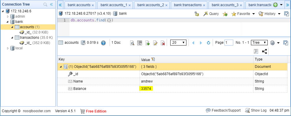 執行 (2) 之後查看 mongo db 的狀態, 帳戶餘額 233574 元