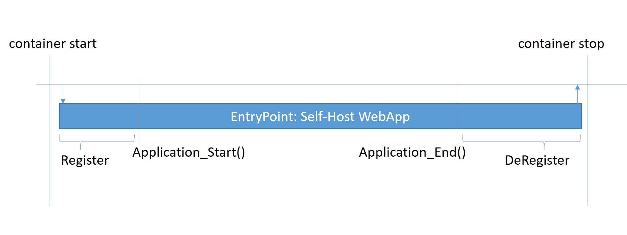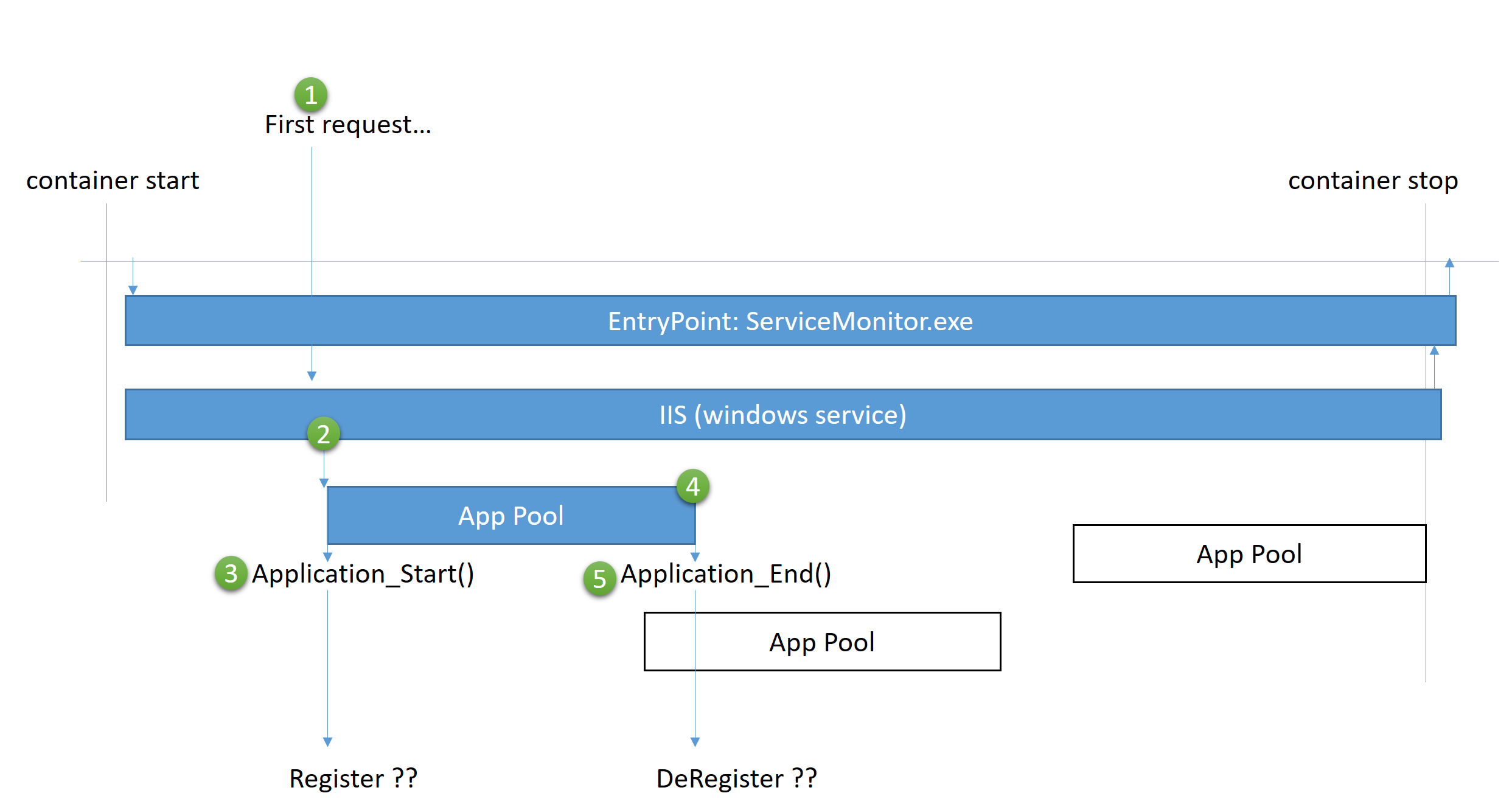 第一個問題,在於圖中的 application start / end events, 在同一個 container 內可能被觸發多次,甚至可能有多個 app pool 平行運行。這會影響註冊資訊的正確性。