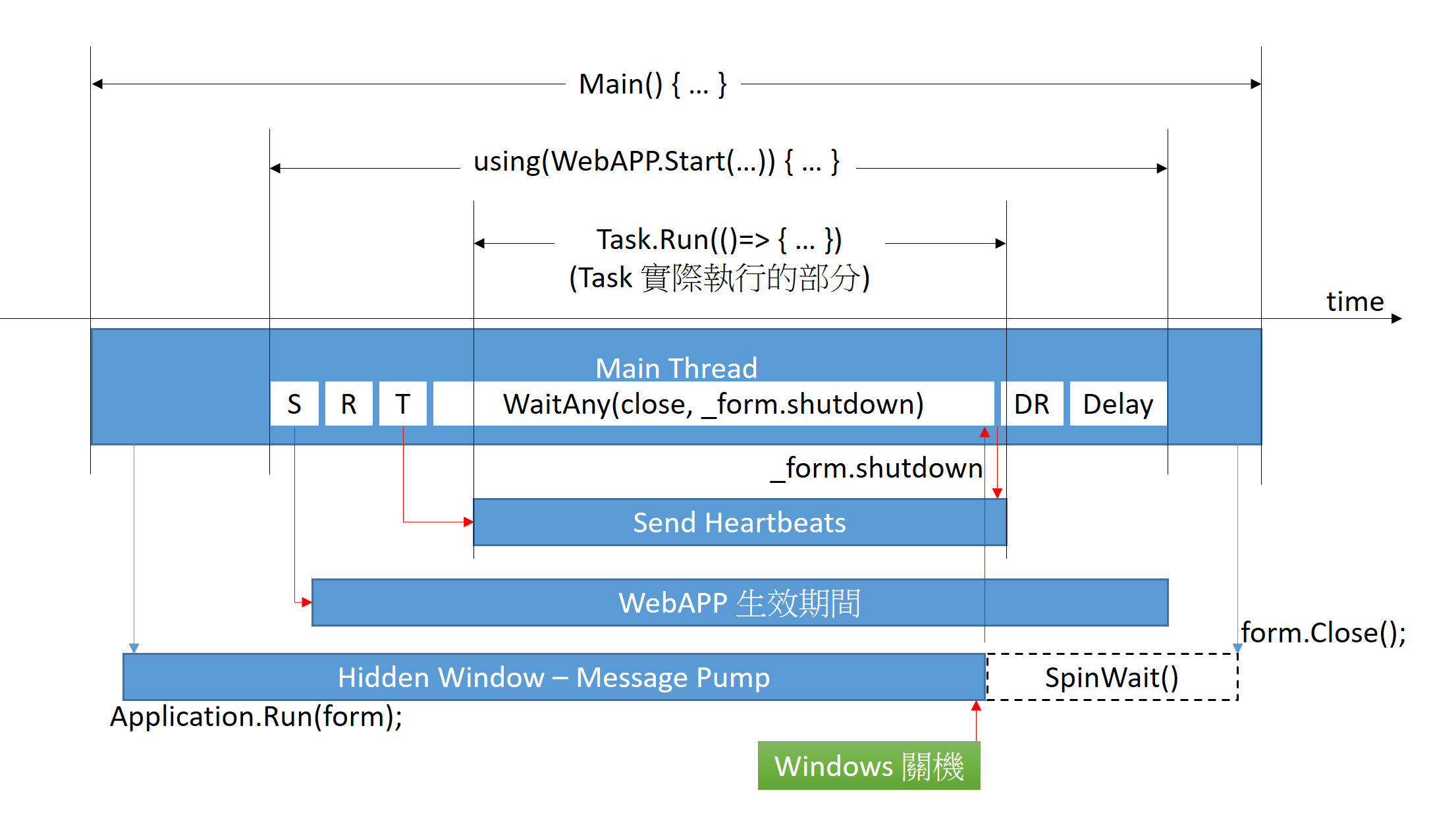 離奇的是,1709 都是得靠 HiddenForm 才能攔截的到 shutdown message, 可是到 1803 反而就能透過 SetConsoleCtrlHandler 攔到 CTRL_SHUTDOWN_EVENT … 攔到之後容許的處理時間也不大一樣,我的例子停了 5 sec 就沒辦法正長的收尾了,上面的 message 只看到 Wait 5 sec … 卻沒看到 5 sec 後的 stopped 訊息。Microsoft 你的文件搞得我好亂啊… 不過 1803 還太新,寫這篇文章的當下 (2018/05/20) 還查不到任何官方文件的說明,這部分有進展我再更新文章。