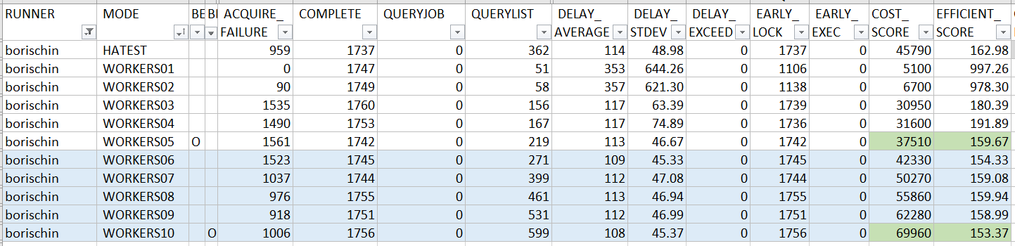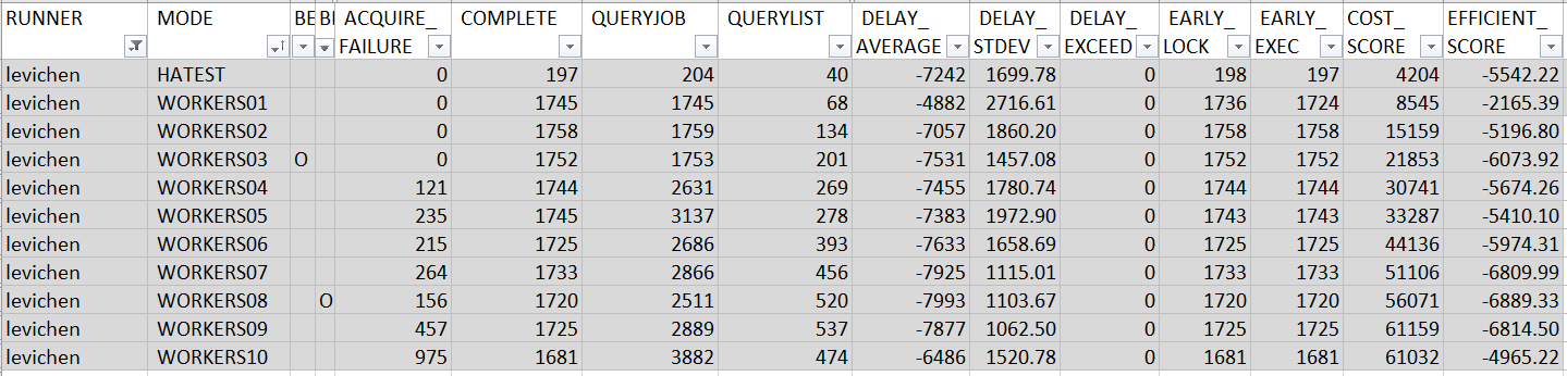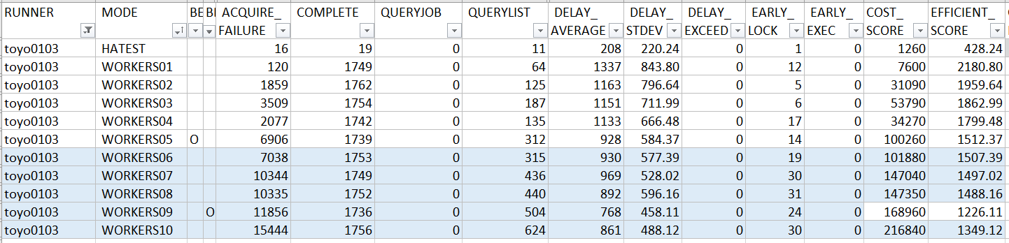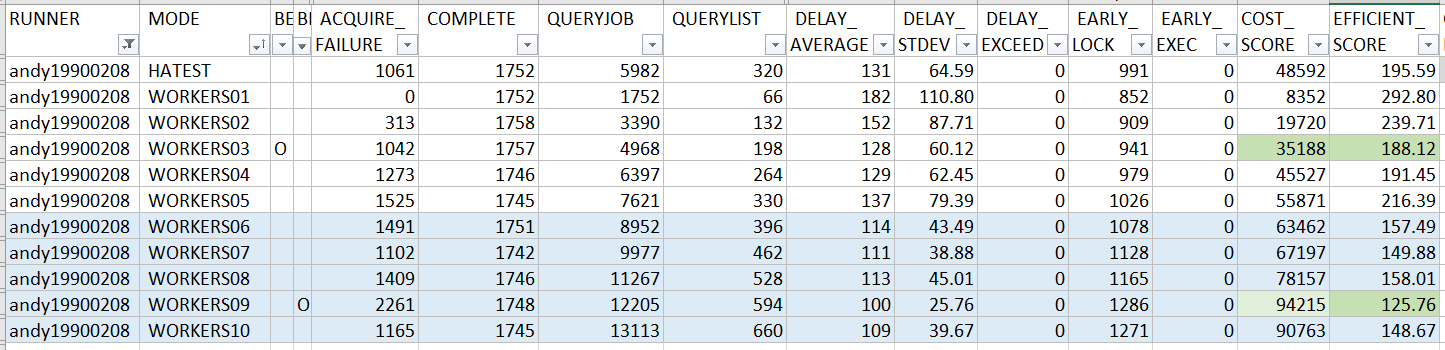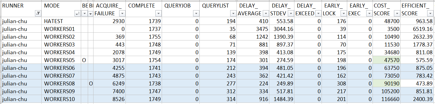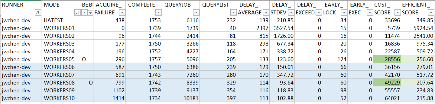 ProcessLockedJob()之外) 都處理完才丟到後端的 worker threads, 代表前面這段是沒辦法平行處理的。因此我預期再這邊若瞬間有多個 job 預約同時間執行, 這作法會在EFFICIENT_SCORE的表現略差