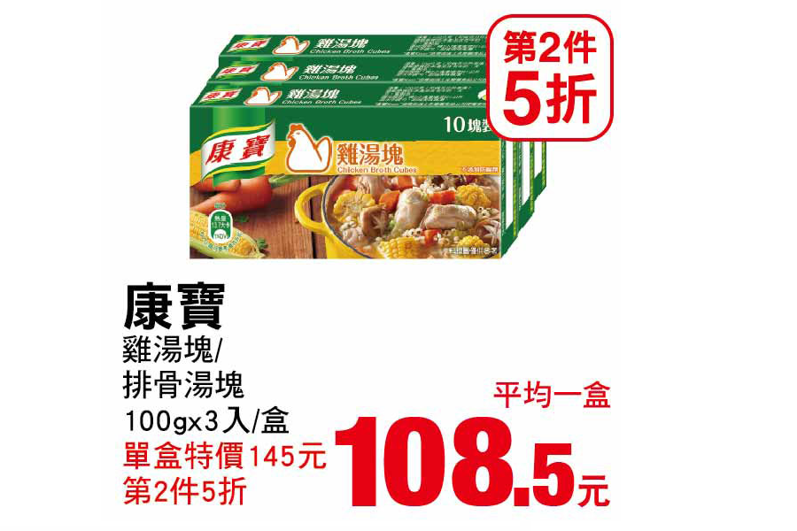 NOTE: 指定商品 (雞湯塊) 單盒特價 145 元,第二件 5 折