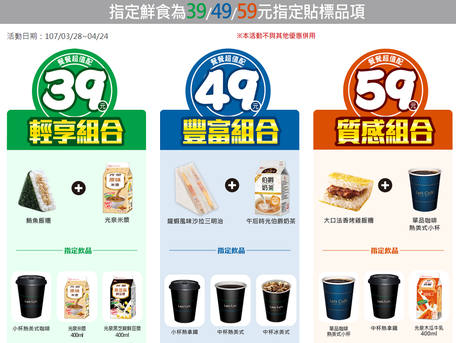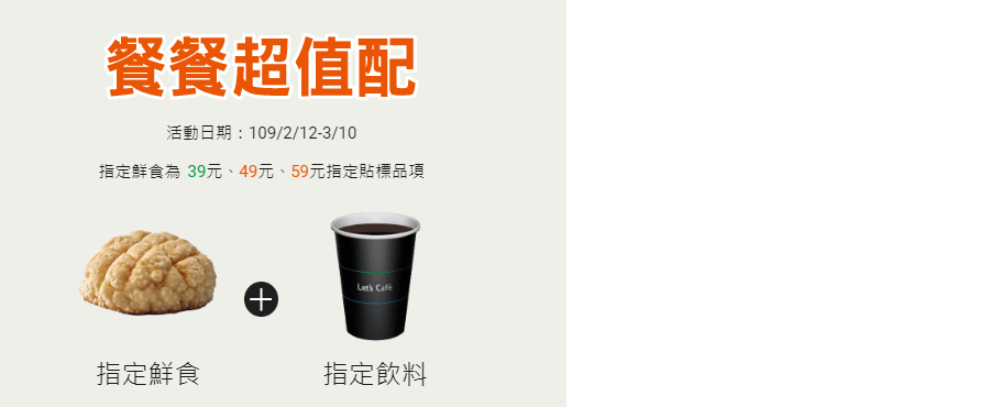 NOTE: 指定鮮食 + 指定飲料 特價 ( 39元, 49元, 59元 )