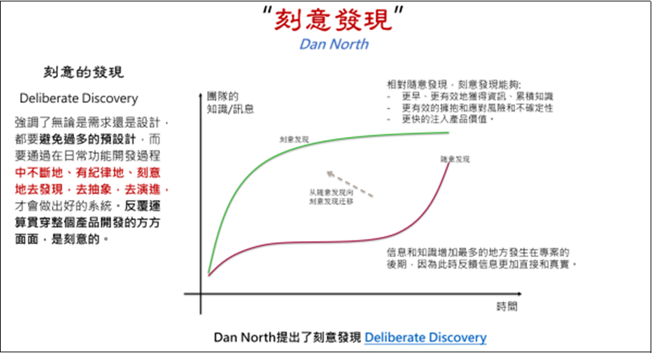 變化越快速的產業,進入門檻越低的產業,這種情況越明顯。敏捷對應這種狀況的解決方式是: 想辦法在前期就有後期的累積知識的速度啊! 只要提高交付的頻率,利用頻繁的迭代,盡可能的提早交付的時間,就可以提早取得重要的回饋,習得關鍵的知識。不過這樣還不夠,另一個角度來看,團隊需要用更積極的方式,透過 “刻意” 的發現問題過程,讓自己能提早得到這些知識。