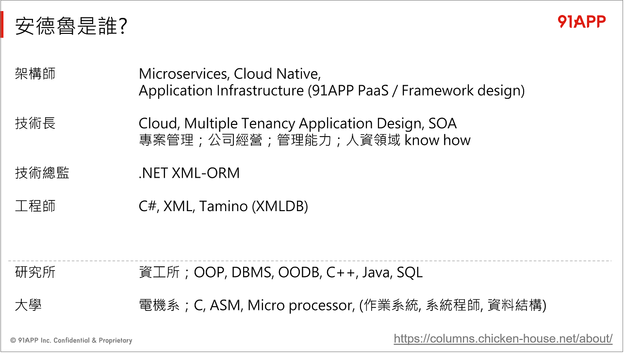 當你掌握基礎知識,也做好能夠自我改善提升能力的準備時,你就開始有能力挑選領域不斷加強自己能力的本錢了。接下來我就用我比較熟悉的 “後端工程師 / 架構師” 的領域為主,用我自己過去的經驗說明一下我的作法。過去很少公開我自己的背景,不過要講到這些職涯的規劃,透漏一些我的背景好了。在 Study4.Dev 這場次,我用了這張投影片來說明: