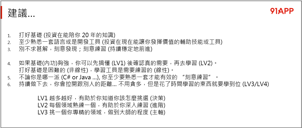 - 請盡量累積軟體開發相關必要的知識與技巧 (例如 TDD, DevOps, 抽象化, OOP, Cloud Native, Security 等等)