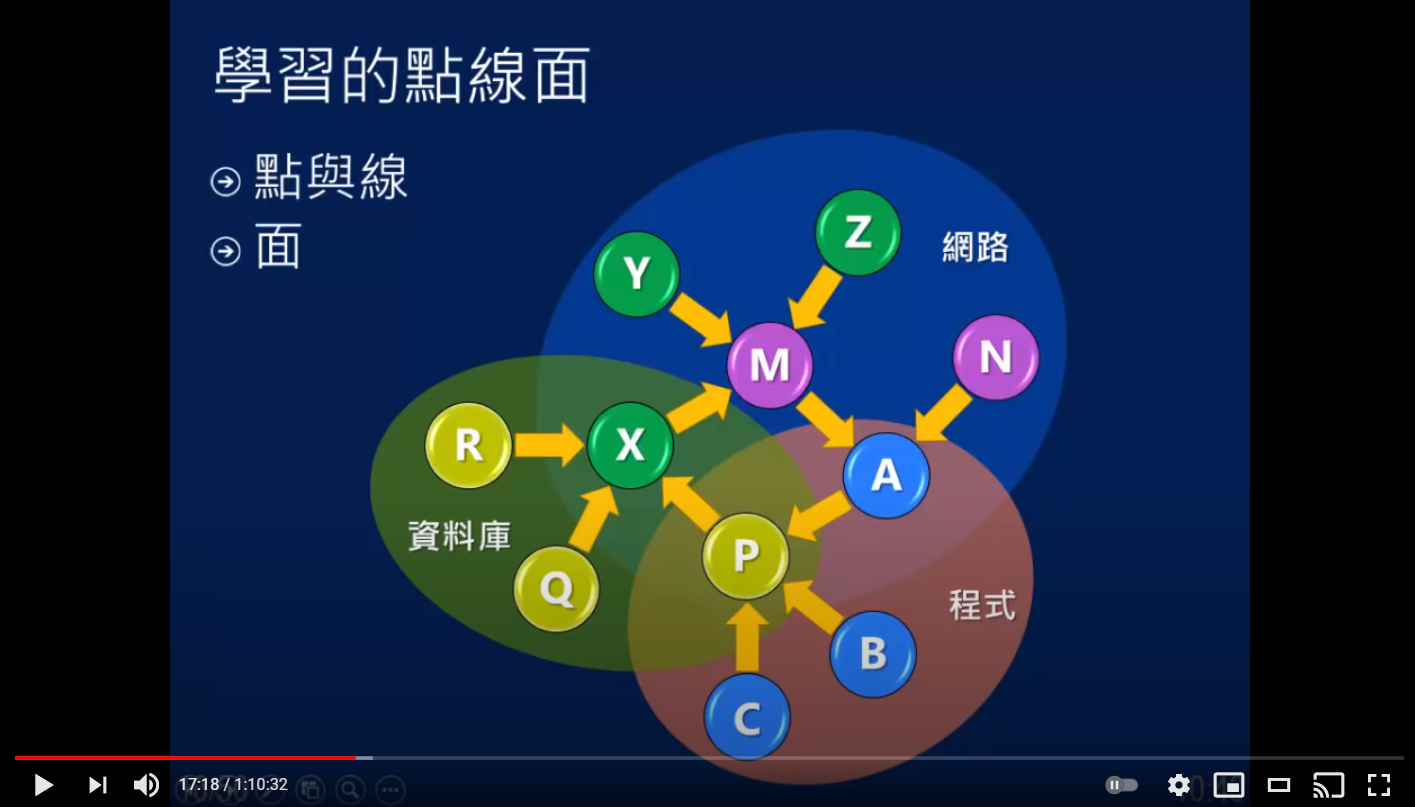 有時候不得不說,一些前輩累積下來的觀點,自己經歷過真的覺得是有道理的。舉例來說很多人都講過類似的觀念,你學到的技能,都是點狀的學習,真正要發揮價值,是把他們串連起來靈活運用才是真正的知識: