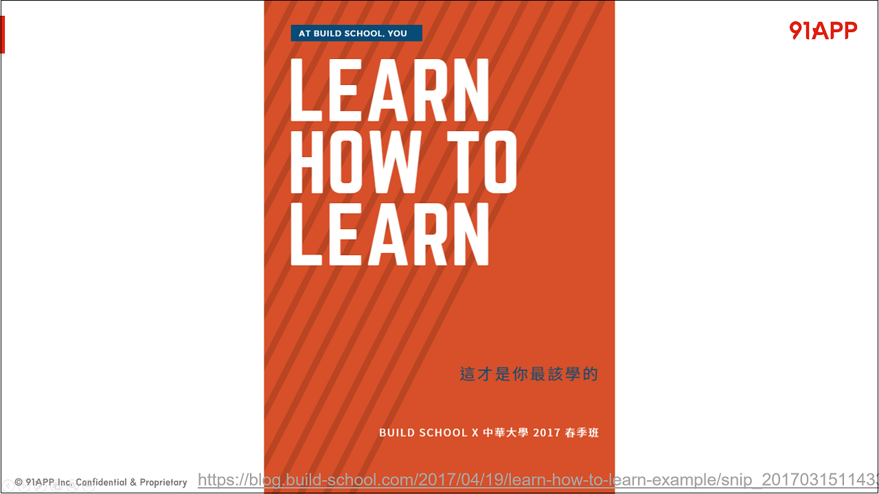 這個 “刻意” 的過程,要認真說起來就是個大學問了,我沒辦法涵蓋所有的面向,我只能就我的經驗,跟大家分享我的應對方式而已。如果這是軟體產業注定要面對的問題,那我會往前一步,在每次都要學習一堆知識之前,我先讓自己準備好能快速學習的技能。Build School 的理念 “ Learn how to learn “ 剛好跟我的想法不謀而合,因此借他們的海報來用一用 (正好當天演講的場地也在 Build School, 轉頭一看背後就貼著這張海報)
