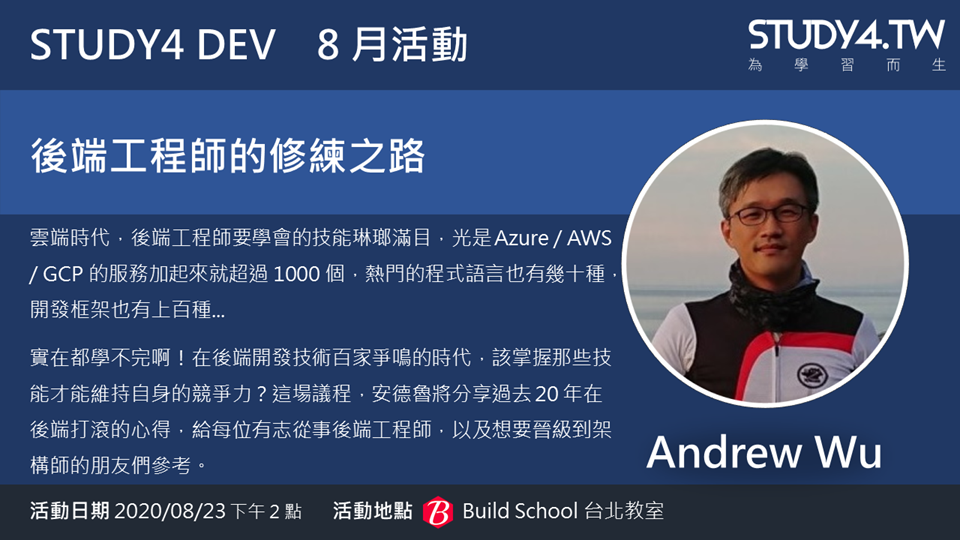 我在下半年的幾場公開演講,開始做了一點不同的嘗試。除了技術或是架構知識之外,我開始會強調為什麼會這樣思考的過程,也開始會帶到該怎麼培養這樣的經驗與能力的想法。在 2020 下半年,有幾場演講都往這個方向調整了。2020 下半年是個爆忙的半年,到現在終於有點力氣把這些內容整理一下了,於是就開了這系列文章 - 刻意練習。這篇是第一篇,主要就是對應到 2020/08 我在 Study4.Dev 八月份活動上分享的主題 - 後端工程師的修練之路。