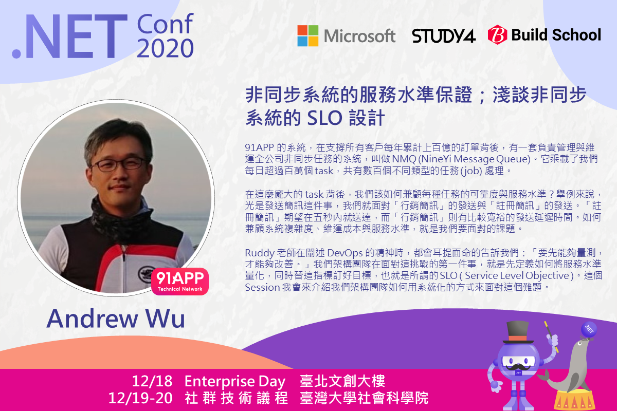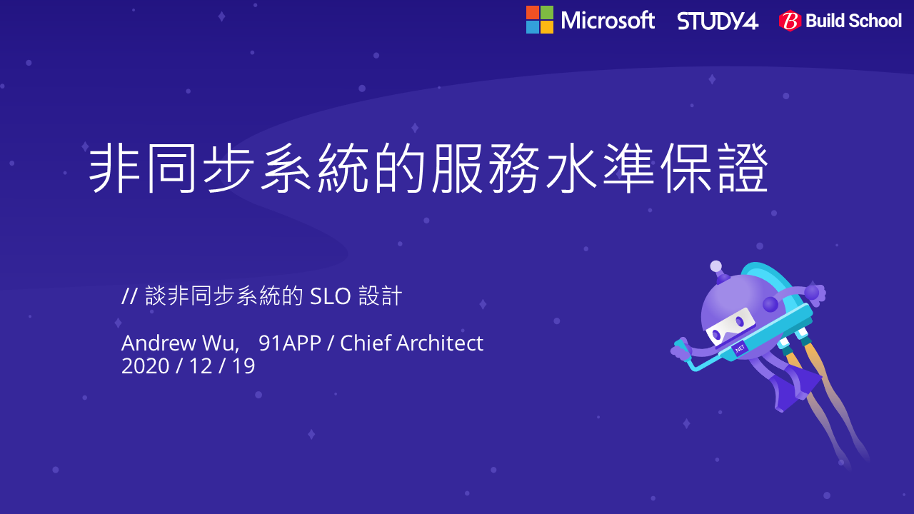 這篇我就拿我在去年 91APP TechDay 以及 .NET Conf 2020 分享的主題: 維持非同步系統的 SLO 來當例子吧。這是近年來我擔任架構師,端出來的幾個 solution 之中,對於 “連結” 這件事最有代表性的案例了。這是個包含開發技術,架構設計,服務水準與流程管理等等層面的綜合需求。要解決這問題,你不但要有很札實的技術及實作能力、也要有很到位的 cloud infrastructure 掌控能力,同時還要具備管理知識,缺一不可,才有可能把這件事情解的漂亮。表面上看來,訂定服務水準要達成的目標 (SLO, Service Level Objective) 並落實,是個很純粹的技術題目啊,但是真正做過的人就知道,光是開規格就不知道該怎麼開了,團隊做出來你也很難驗證 (直到上線後碰到流量撐不住之後… )。