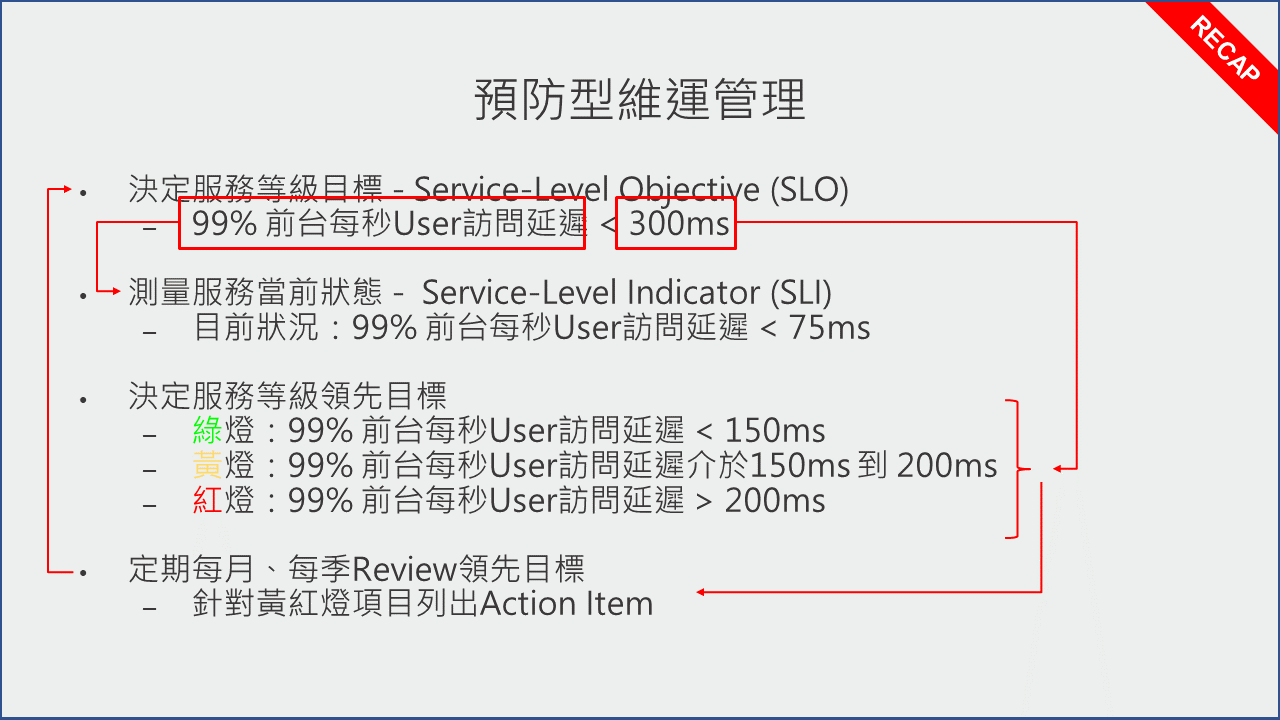 維運團隊的值班人員,按照這個流程,理論上都能在第一時間讓系統回復正常的服務水準。不過指標會亮黃燈或紅燈,可能是個案,也可能是個趨勢。同時對服務水準的期待 (SLO),也有可能因為市場或是使用者的變化而有所改變。這時維運團隊應該定期檢討指標是否合理? 例如是否該將 300 msec 的要求調低? 或是檢討過去一個月進入黃色燈號的比例已經提高,系統本身應該有其他狀況需要額外處置 (效能優化,或是擴充運算能力等等)。