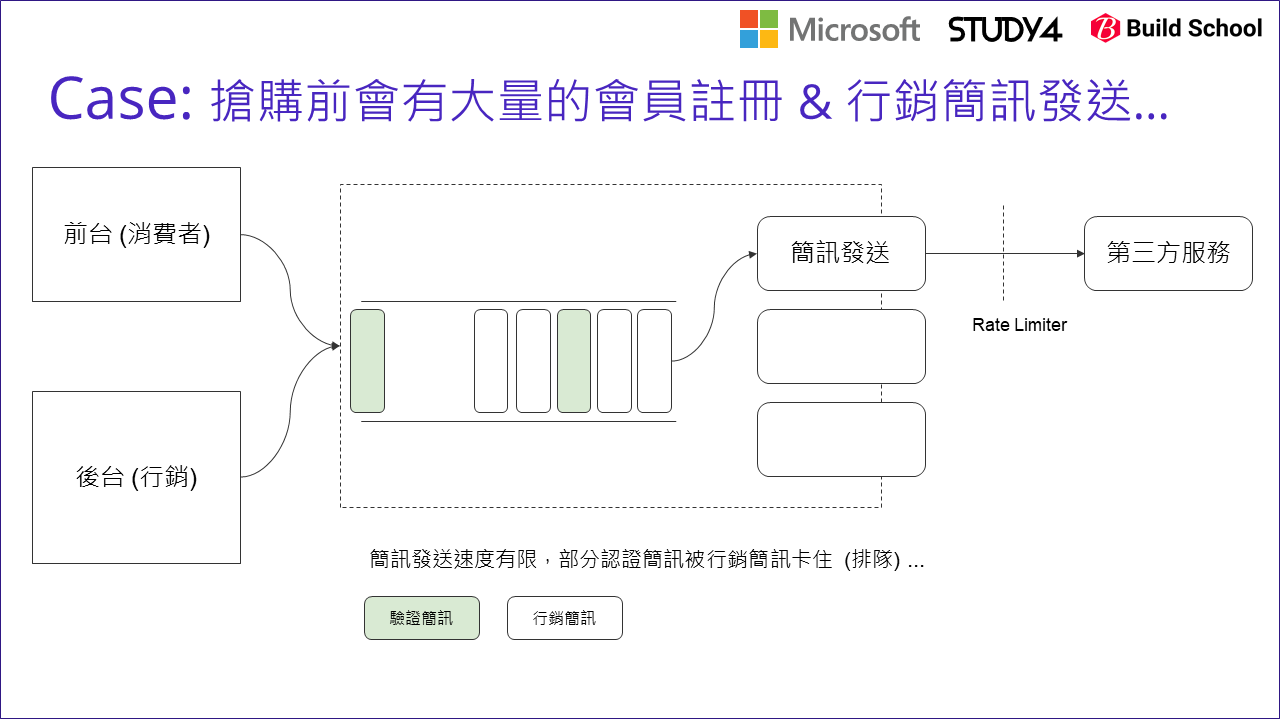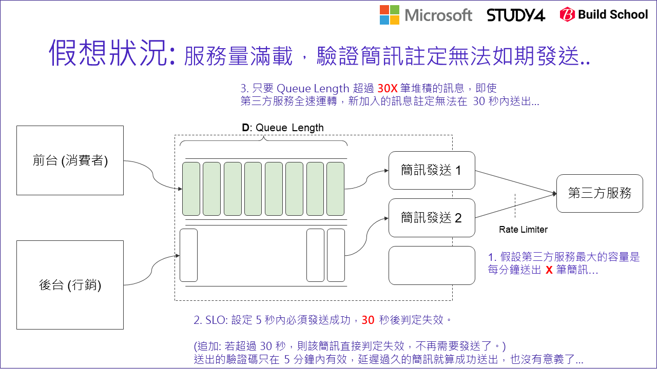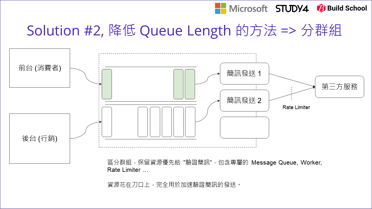 從工程角度,我們很容易地把 “同一種功能” 集中起來重複使用,這很自然,不是嗎? 於是,當驗證簡訊開發完成後,另一個團隊需要發送行銷簡訊,當然就共用同一套 code 了。於是系統就長成上圖的樣子。這時,當碰到周年慶或是大型活動時,瞬間有大量的行銷簡訊發送,於是 message queue 就開始堆積了… 雖然系統不至於垮掉 ( message queue 能夠調節負載,後級可以用最有效率的節奏,穩定的持續運行 ),但是… 驗證簡訊被迫開始要跟著一起排隊,有些簡訊無法在 5 sec 內被發送出去…