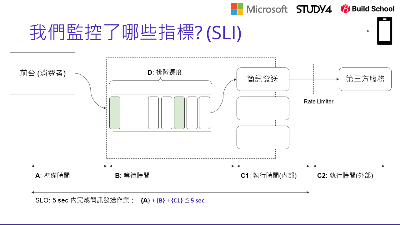 發送簡訊的要求,在我們系統內部就拆成這三段,因此我只要能夠監控這三個數據,加起來別超過 5 sec 就是了。因此,開發團隊開始接到新任務,必須按照監控系統提供的 metrics collect API 的定義,把這三個指標送進去。監控人員必須設定警告條件,當 A + B + C1 > 5 sec 時就該發送警告通知。