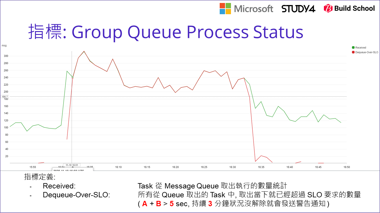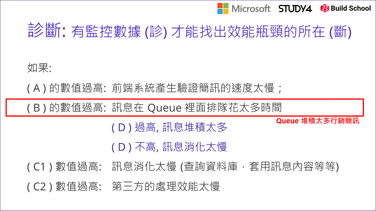 當然,每個數值多少算高,多少算低,都有定義,我這邊就省略這些細節,只講重點就好。團隊按照 SOP 做了處置,判定 (B) 的數值過高。不過 (B) 過高還可能有兩種狀況,一種是真的訊息發送量太大,所以堆積太多排隊排太久… 另一種是訊息量正常,但是後端處理很慢都有可能。為了進一步區分這兩種狀況,我們引入了第四個指標: