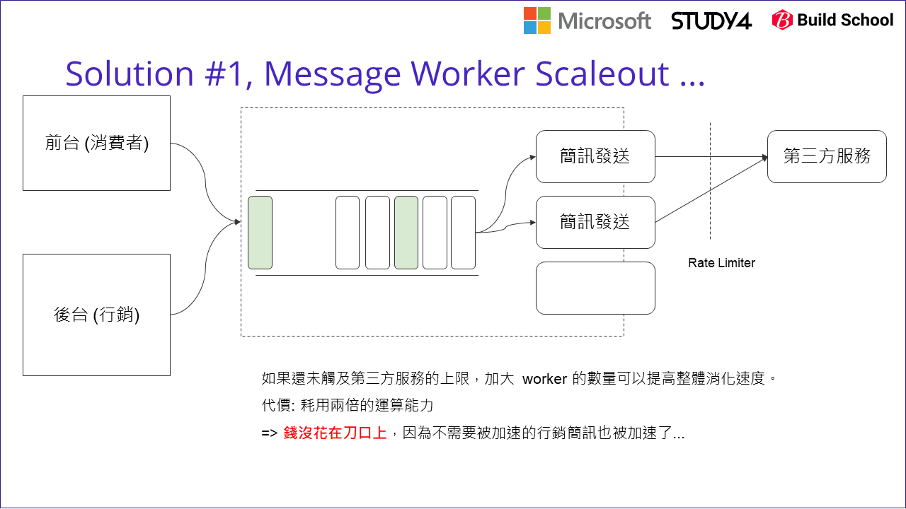 當然把 database 切割也是個好作法,但是需要的時間、人力以及成本也都是不同數量級的解決方案。在還沒準備好投入這些資源之前,你該做的就是前面講的: 你該想辦法控制你的生產線 (這邊指的是交易後處理),讓他跑到理想的速度就好,這個速度也許會低於目前執行速度,你就該想辦法替他降速。當你找到瓶頸在哪裡時,降速就變得很容易了。以我們的例子,我們就簡單的在 “交易後處理” 的 worker 加上 Rate Limiter.. 怎麼替你的應用程式做 rate limit ? 很簡單啊,你研究過 QoS 的演算法之後,自己實做其實很簡單的。同樣的當年我也寫過一篇類似的文章,有需要的朋友可以參考: (微服務基礎建設: 斷路器 #1, 服務負載的控制)[/2018/06/10/microservice10-throttle/]