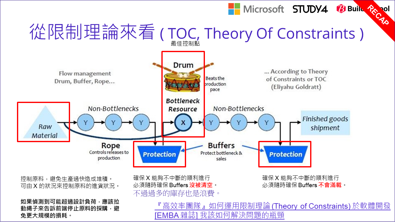 這個主題我也在這裡總結一下,別過度專注於局部的最佳化。回頭看一下限制理論的那張圖,實際生產線可能不是那麼單純,就一條路從頭到尾跑完就結束了。也許主線某個流程需要的原料,就是另一條生產線提供的啊! 因此實際運行的系統關係可能更錯綜複雜。這時適度的抽象思考是必要的,除了瓶頸前需要 Protection 設置 (buffer) 之外,有留意到嗎? 最後完成的地方也有設置 Protection, 而 Drum 也會有 Rope 連接到源頭 Raw Materials… 意思是你考量生產線的效能時,至少要同時關注這三個環節: