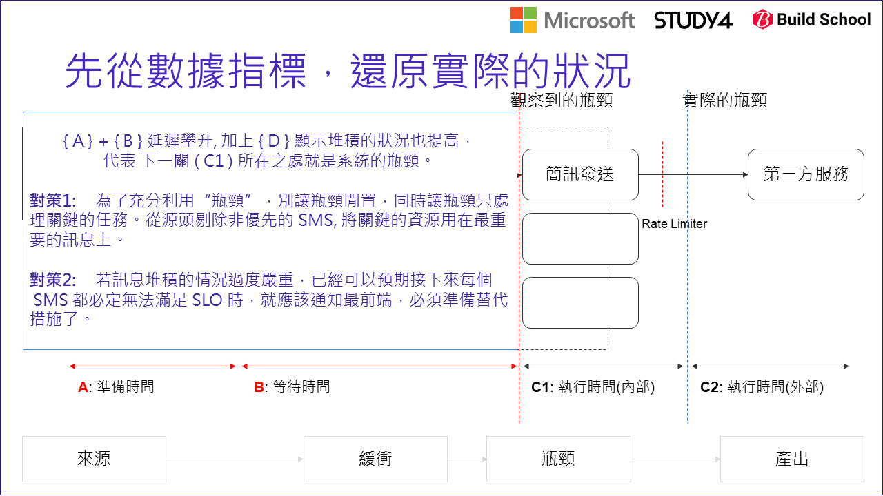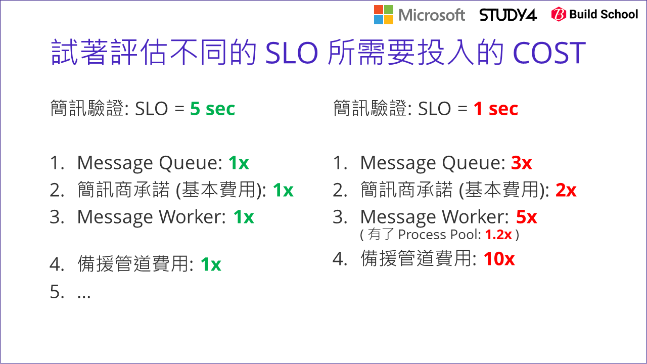 當時當我接到這挑戰,思考到這個層面時,我才開始意會到,光是把 code 按照規格寫好,光是把效能調教好是不夠的 (即使這件事我做到 100 分也一樣)。我必須多做點什麼,搭配額外的手段 (不管是技術還是非技術手段) 才有可能。所以我才聯想到過去的一些 Cloud Infra 的基礎知識,以及擔任主管時學到的管理技巧,並且思考將他們應用在系統上…。