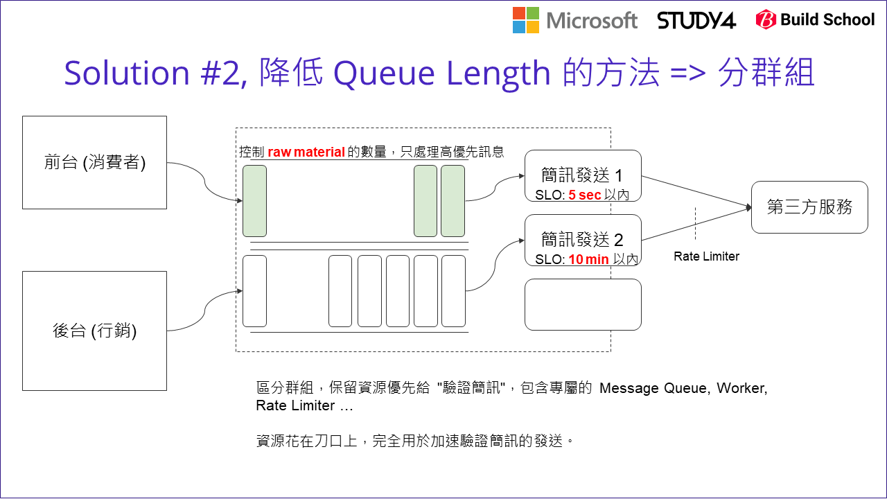 觀念上是先將要處理的訊息,從源頭就按照期待的服務水準分開。一模一樣的架構複製兩組 (其實最主要的差異就是分成兩個獨立的 message queue),然後只針對 SLO 要求較高的註冊驗證簡訊那組,執行需要較高成本的解決方式: 擴大 worker 的數量 ( scale out )。