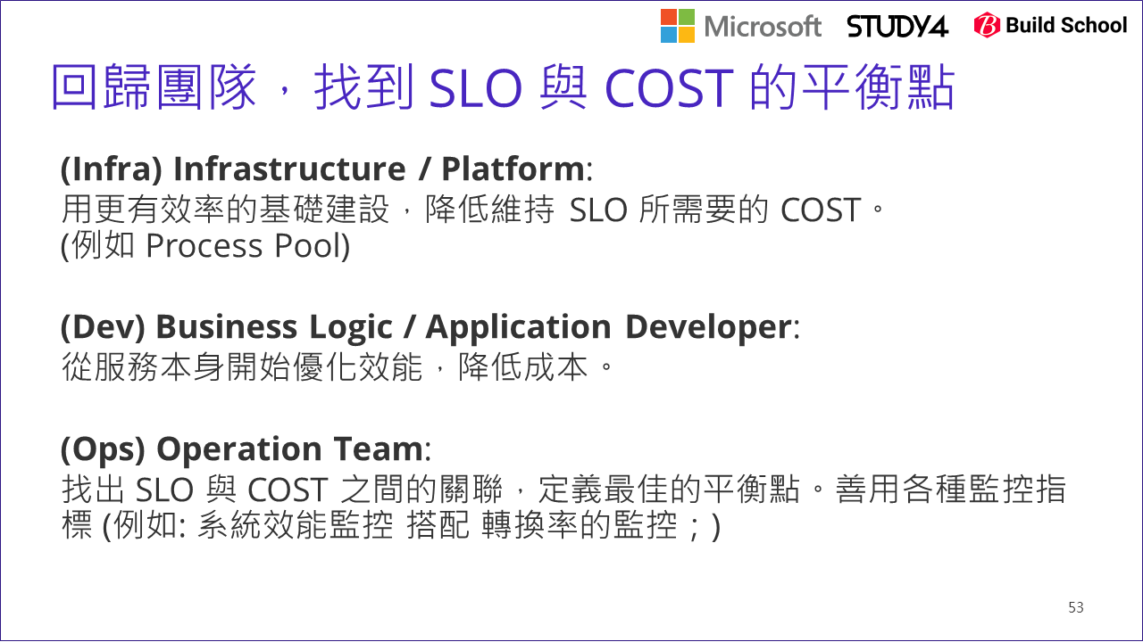 - 過去多著重在開發實務,系統越趨成熟維運的重要性也會逐漸提升,以服務目標與結果來推導過程的思維,非常受用