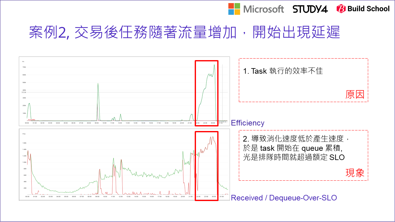 我們把案例的場景,從發送驗證簡訊改成線上交易。線上交易成功後,通常後台還有一連串的任務要處理,例如發出單據等等內部財務流程。這些都很重要必須使命必達的,但是由於他跟前端消費者沒有直接關連,因此我們不需要計較 5 sec 這種等級的 SLO,也許是 5 min 內完成都可以。相對於完成時效,也許確保他能安全可靠的執行完畢會更重要。然而,當你你發現你交易後的處理的狀況開始出現瓶頸,效能不如預期時:
