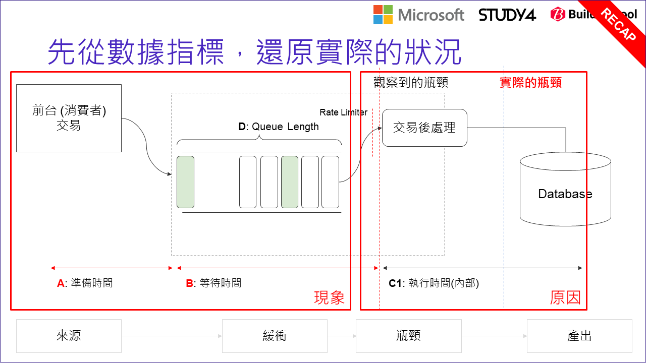 但是,有時瓶頸出現在你觀察不到的地方啊! 以上圖為例,真正的瓶頸 (這是事後才知道的) 是在最後面的 database, 但是因為指標沒有涵蓋到這段,因此我們看到 (D): Queue Length 變大,誤以為 worker (交易後處理) 是瓶頸… 於是就執行了一連串的優化 (例如 scale out), 直到…