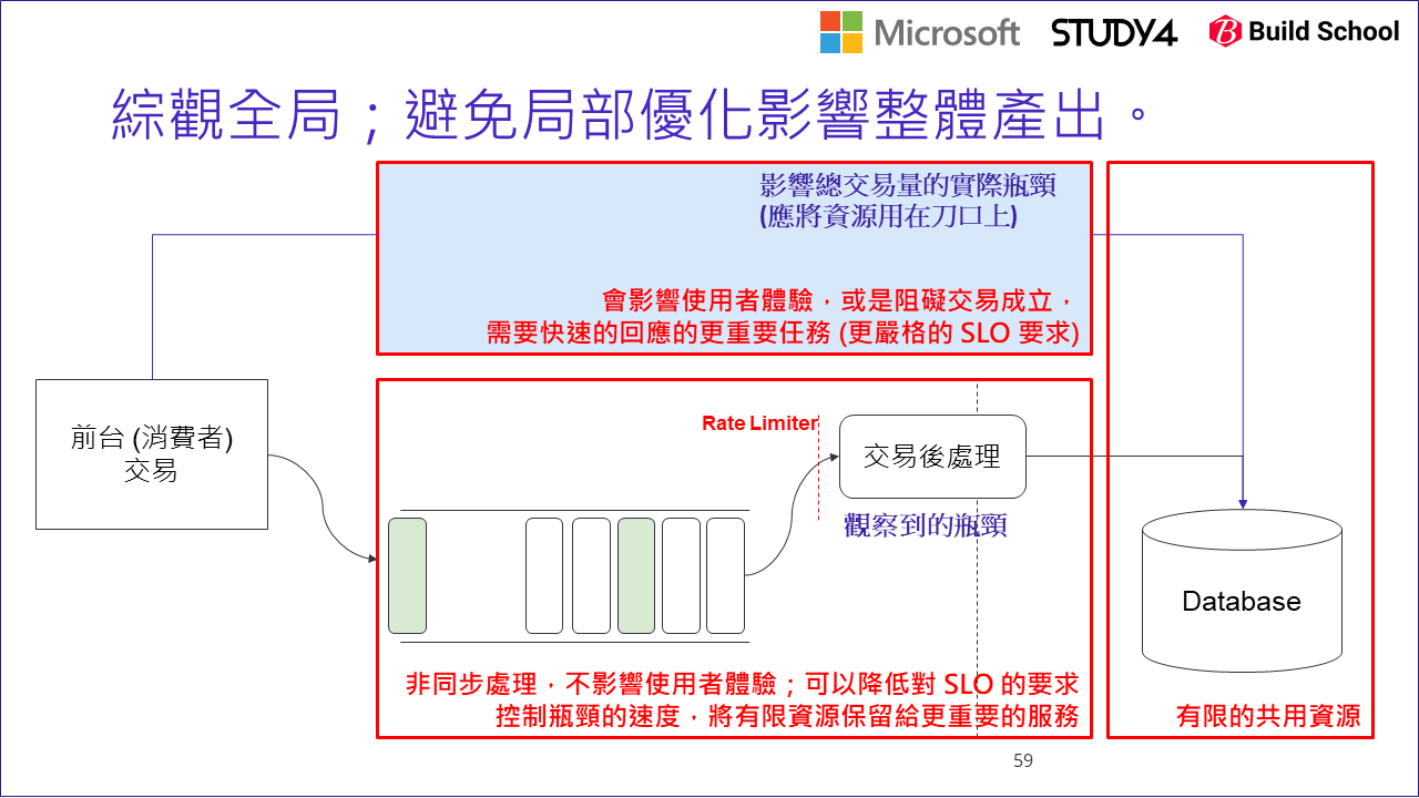 這個案例,其實帶入了兩個不同層級的瓶頸啊,一個是自身流程內的 “交易後處理” worker, 另一個則是共用資源 database, 當你解決了眼前的瓶頸效能後,第二個瓶頸開始浮現出來,變成整個系統的新瓶頸了。理想的情況下是你不斷地解決眼前的瓶頸,總有一天就能夠提升整體系統的效能啊! 不過這個案例,我則著眼在眼前的瓶頸已經解決後,浮現的新的瓶頸還沒辦法解決前的這段時間處理方式。我的應變方式是要從整體考量,眼前的瓶頸一次解決最好,不一定是整體最佳解。這時與其讓他全速衝刺,還不如調整成最佳速率。