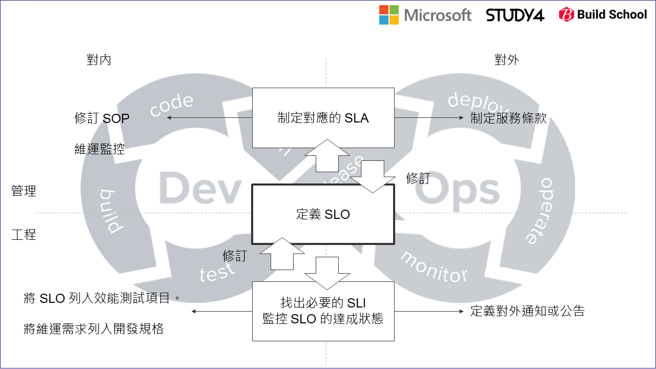 服務水準的改善當作執行的流程套用上去。所有跟服務水準相關的議題,我一律以 “目標” (SLO) 為核心,先定義出你的服務水準目標到底定在哪裡? 要訂多高? 把定義跟目標抓清楚之後,中間的 “定義 SLO” 夠明確清楚,就能往上下擴展了。 -