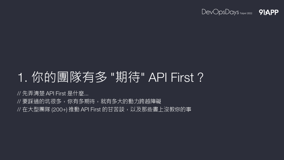 這篇的內容,是我在 DevOpsDays Taipei 2022 的 Keynote 演講的主題: DevOps 潮流下的 API First 開發策略。這場次的內容,正好是我近期正在努力的方向,演講的時間有限,沒能 100% 表達我想講的內容,於是我還是用我最習慣的方式: 文章,重新來闡述一次這個主題吧。