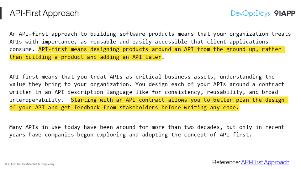 這篇文章: API-First Approach 中間提到這段,就是我 slide 標黃字的兩句話,是我覺得特別有代表性的部分: