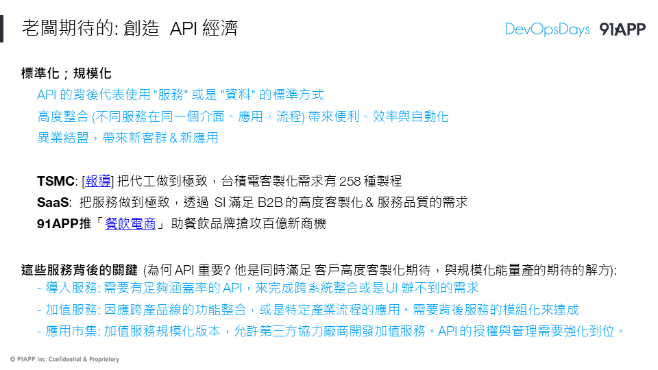 回想一下,這不就是上面樂高的情況嗎? 如果你只想拿標準的積木去應付特殊需求 (例如組出一台千年鷹號) 是很困難的,你應該在標準化積木的基礎上,適度的加上部分相容但是是特殊造型的零件才能完成。這不就是你自己用 API 來擴充你的系統嗎? 也因為這樣,我們內部很認真地看待 API First 這件事,也因為參與其中,才有我這次的 keynote speech. 掌握正確精準的 API, 你才能同時滿足每個客戶對你規模化與高度客製化的期待。