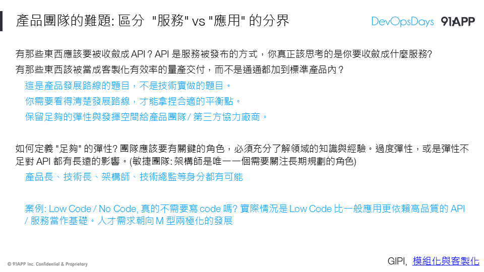 你的團隊開始需要專人負責 API 的設計開發,他必須越來越專精,設計開發的品質要求越來越高,人的技能跟經驗要求也越來越高,這是無可避免的,這組人會往 M 的一端發展。有了這些武器,你需要越來越多的團隊來打仗,開發更多應用,擴展更多的領域,甚至有內部團隊跟外部合作的協力廠商等等。擴大的必要條件就是降低門檻,最近很熱門的關鍵字 Low Code / No Code 就是應用在這種場合,因為門檻越來越低,這些角色會越來越偏向 M 行的另一端。這兩者的平衡,GIPI 的一篇 FB 貼文正好很洽當的闡述了模組化跟客製化的光譜。我先給連結,後面的段落我會再提到一次,到那邊在來聊聊這個題目。