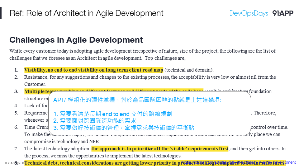 因此我多準備了一段: 就是 “架構師在敏捷團隊中該扮演的角色”,這是我在演講當下沒時間聊到的段落,我在文章內也把他補上了! 同樣的內容,除了 DevOpsDays Taipei 2022 Keynote (2022/09/16) 之外,我事後也跟保哥進行了一場同主題的線上直播 (2022/10/07),相關連結我擺在文章最後面。你可以選擇你想要的方式來了解,不過我個人是最推薦看我部落格文章啦 :D