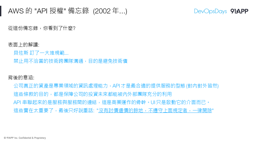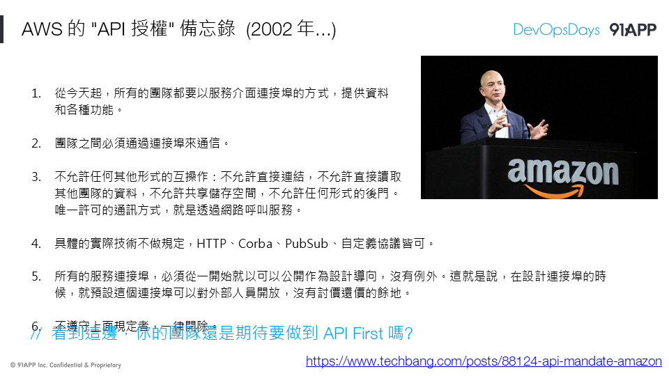 我就舉最具代表性的案例好了: AWS (Amazon Web Service) 的前 CEO 貝佐斯, 他也是帶領 AWS 走到今天這步的最大功臣。他在 2002 年的時候 ( Orz, 20 年前就有這遠見 ),在內部發布了一份備忘錄。內容主要是工程團隊所有服務都應該以對外開放的標準提供 API,跨團隊間 API 是唯一的溝通管道,沒有例外。我把他的備忘錄內容列在這頁投影片: