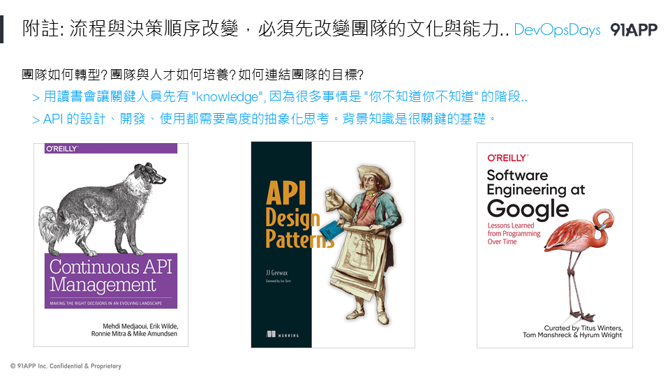 寫到這邊,我想對於 API First 的 “期待”,跟背後的想法,應該都交代的差不多了。在進到下一個主題前的最後一段,我想提一下這些思維跟流程的改變,文化跟能力的準備是很重要的啊! 所有改變都是困難的,因為你必須面對團隊過去習慣的做法跟想法。沒有足夠的準備跟動機,這些傳統是會持續維持下去的。講了這麼多的 API First 期待,我想這些都是 “動機” 的部分,而能力的準備,只能靠有系統的吸收他人的經驗了,最好的方式是讀書會,有系統的透過研讀其他成功的案例來獲取經驗跟能力。