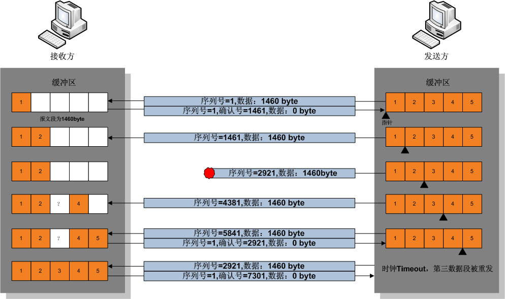 其中有一張圖,說明了傳輸過程中接收端怎麼靠 buffer + ack 達成這件事: