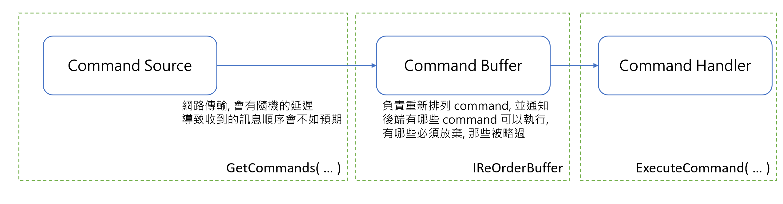 需要緩衝 (buffer) 來存放未按順序收到的 command, 重新排列後往後送的機制 (IReOrderBuffer) - command handler: